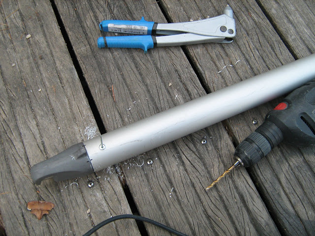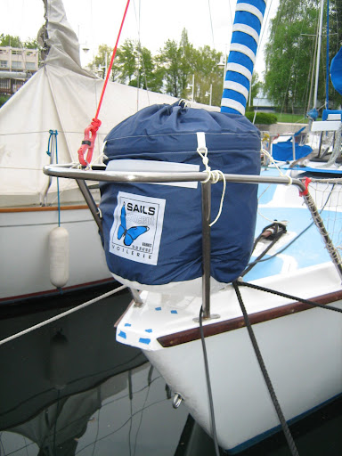 Ca y est, je suis au bateau! Je passe le week-end au lac en profitant de l'accalmie... Il ne fait pas trop chaud pour l'instant, mais ce n'est pas grave. J'apprécie tout de même! J'ai monté les embouts de tangon sur le tube de tangon cet après-midi. J'ai aussi changé la drisse de spi. Il faudra que je monte quelques pontets sur le mât et le tangon pour gréer la balancine. Du coup, je monte au niveau des barres de flèches demain pour percer des trous et pour poser un pontet et une poulie.
