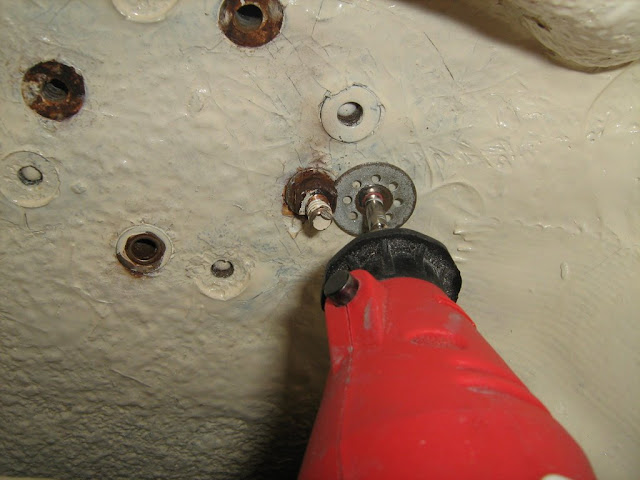 Alors, au menu du jour j'avais comme mission d'enlever l'ultime passe-coque sous le cockpit. A vrai dire, l'aventure des passe-coque s'est bien passé mais c'était une mission ardue. Très honnêtement, je dirais que les passe-coque ne datent pas d'hier, voire ils sont d'origine. Du coup, même si l'on essaie de tourner un écrou, ça ne bouge pas... L'outil de dernier recours c'était mon petit Dremel doté de disques coupantes. Avec une bonne dose d'huile de coude et un peu de patience ça prend forme. Il y a donc 4 trous dans la coque. Je pense que ça va aller nettement plus vite quand je remplacerai le tout avec du neuf! A suivre...