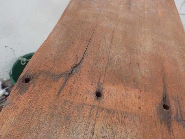 Alors je me demandais si éventuellement la solution n’était pas simplement de le décaper à nu, peut être de le laisser tremper un moment dans de l’eau douce afin de le dessaler en profondeur (?), de le laisser bien sécher pour ensuite l’enduire de plusieurs couches de résine afin de redonner de la dureté et de la structure à cet important espar… ?