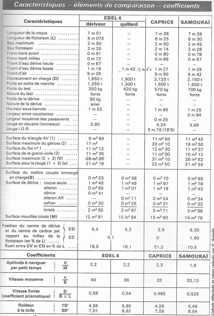 Caractéristique et comparatif de la version dériveur et quillard. Ce comparatif réalisé par le mensuel Bateau N°100 compare également l'edel4 à 2 autres voiliers : Samouraï, Caprice